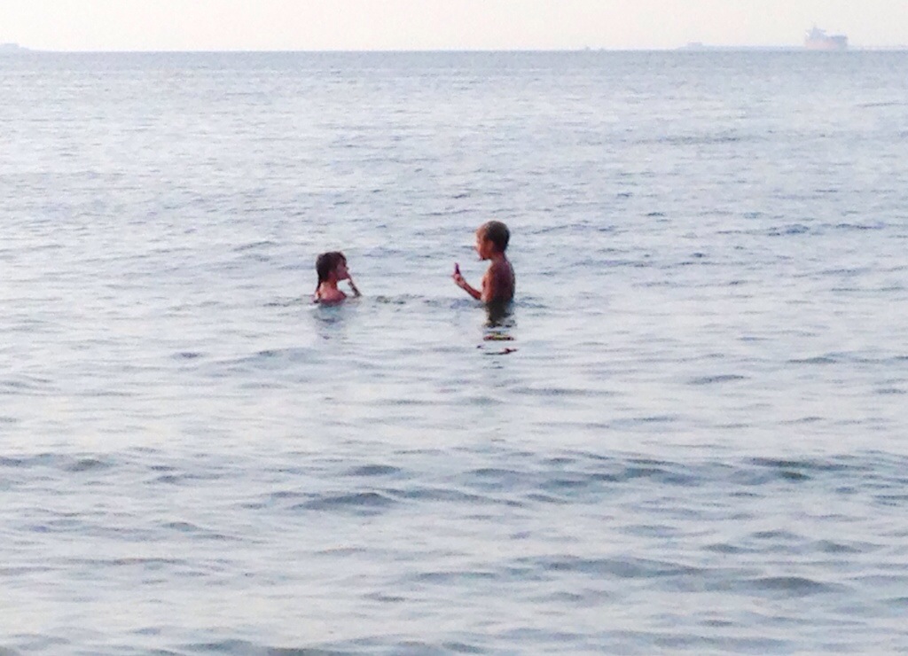 She told me later that she was talking to him because he wanted to see her beautiful seashell. So, she gave it to him and they talked and then he gave it back and they just hung out in the water afterward.